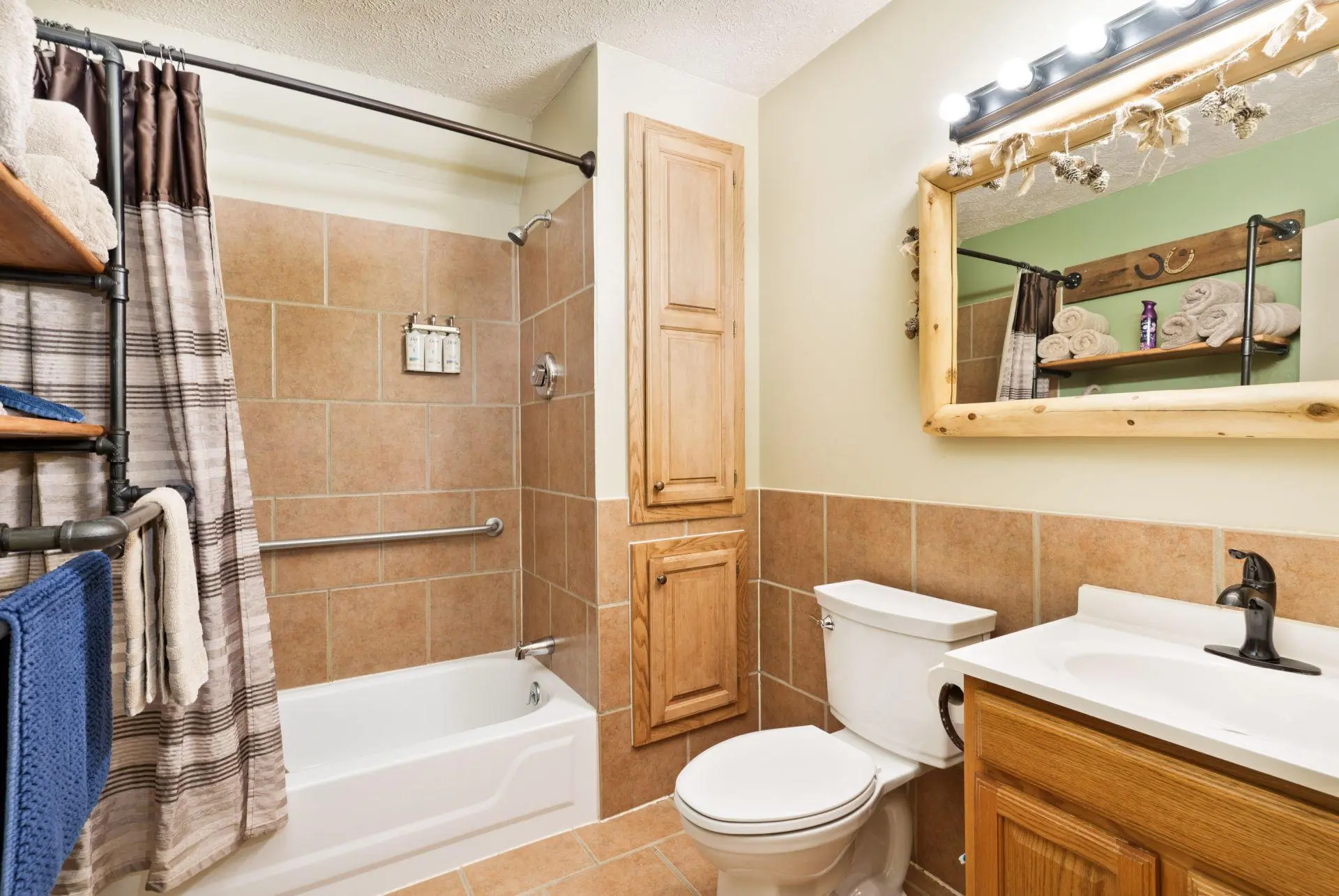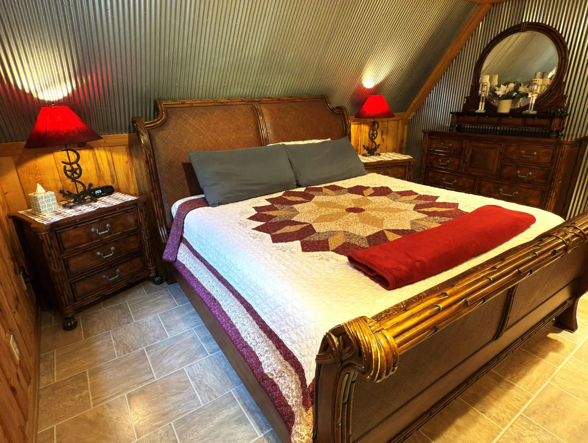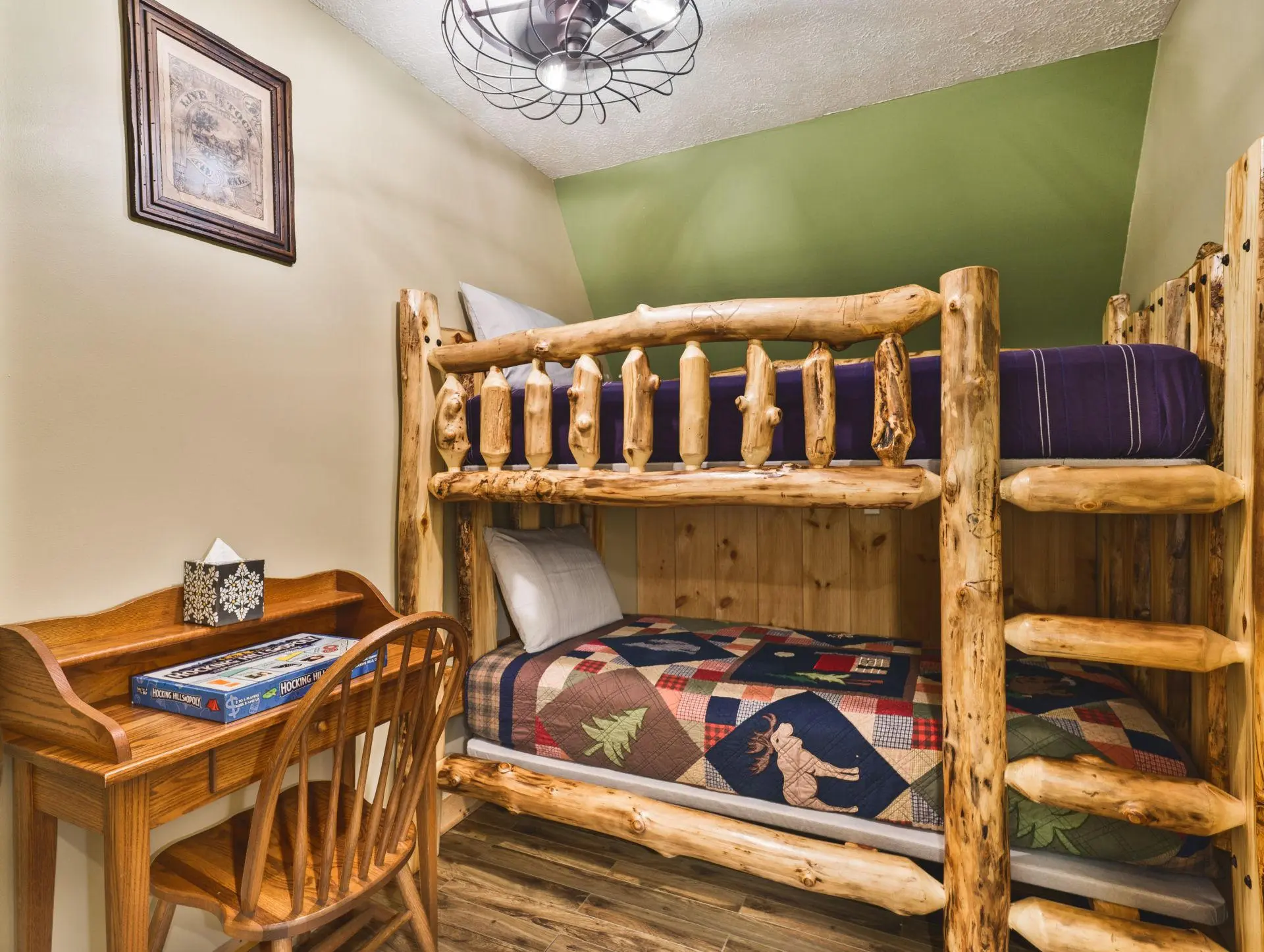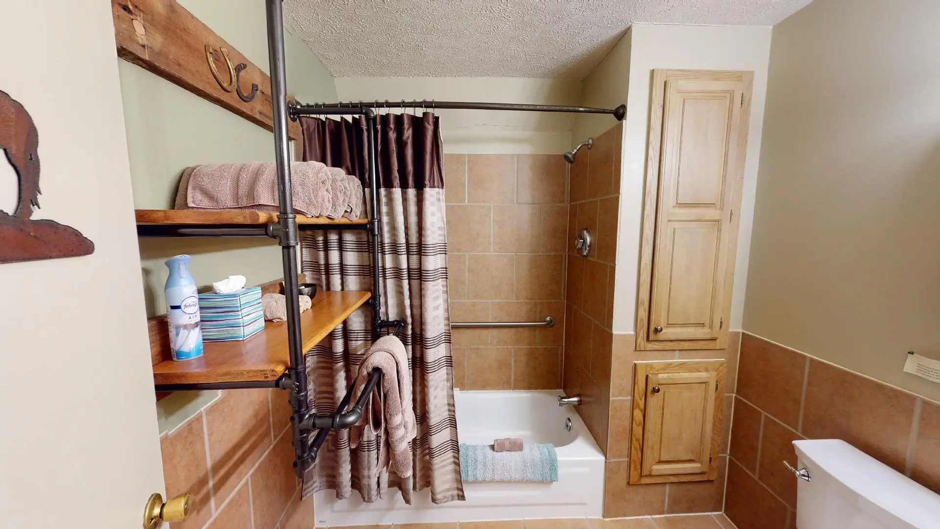 The large tiled bath is also on the main floor, and sports a full tub/shower. Three private bedrooms, one with a King-sized bed, one with a Queen-sized bed, and one with a Bunkbed, allows guest the comfort to enjoy the Hocking Hills with their family..